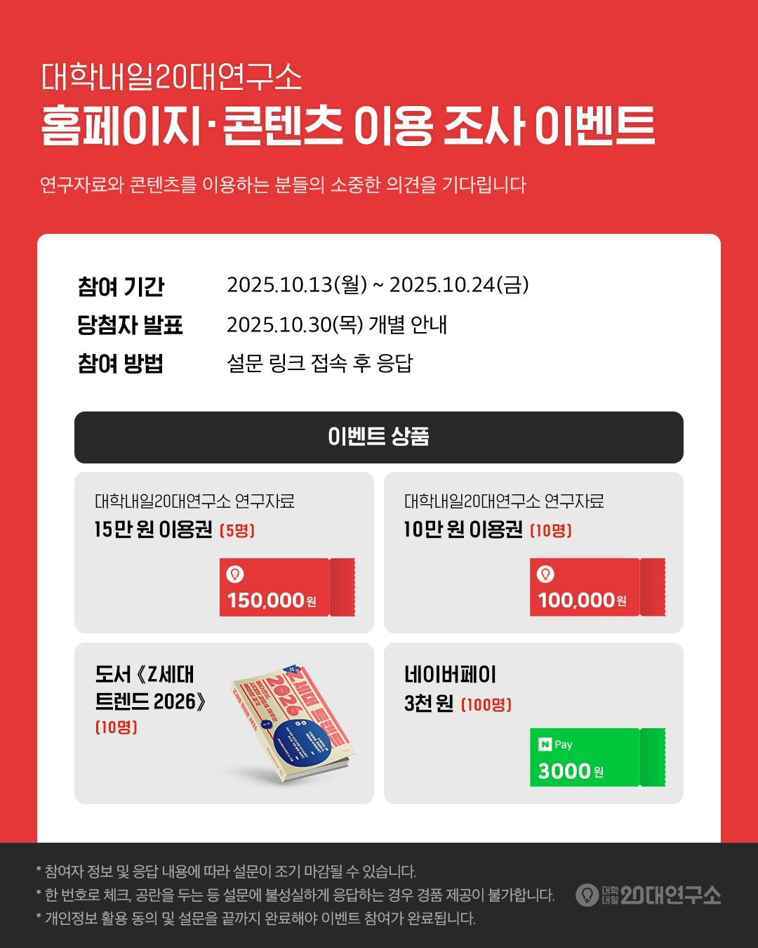대학내일20대연구소를 찾아주시는 분들을 대상으로 홈페이지 및 콘텐츠 이용 행태와 인식을 알아보기 위한 설문조사를 진행합니다. 좋은 의견을 주신 분을 선정하여 대학내일20대연구소 보고서 이용권 및 트렌드 도서, 네이버페이 3천원 금액권을 드릴 예정이오니 많은 참여 부탁드립니다! ◼ 설문 기간: 2025년 10월 13일(월) – 2025년 10월 24일(금) ◼ 당첨자 발표: 2025년 10월 30일(목) ◼ 응답소요시간: 10분 내외 ◼ 설문을 완료하신 분 대상 추첨 선물 - 대학내일20대연구소 연구자료 15만원 이용권 (5명) - 대학내일20대연구소 연구자료 10만원 이용권 (10명) - 《Z세대 트렌드 2026》도서 (10명) - 네이버페이 3000원 (100명) |
