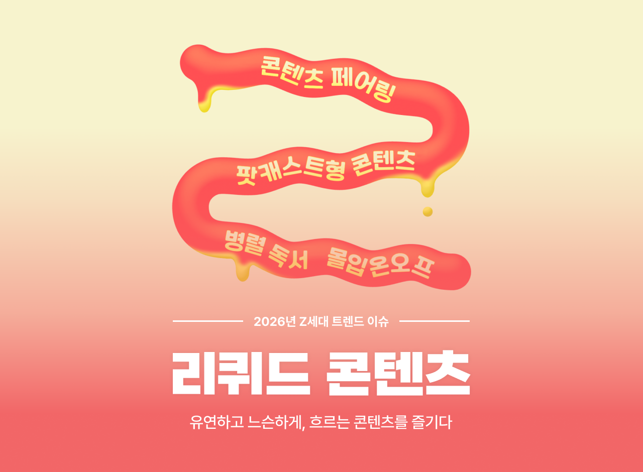 <Z세대 트렌드 2026>에서 대학내일20대연구소는 물처럼 유연하게 느슨하게 Z세대의 일상을 채우는 콘텐츠를 ‘리퀴드 콘텐츠’라고 정의했습니다. 리퀴드 콘텐츠의 부상은 Z세대의 여가 생활과 산업 전반에도 영향을 미치고 있습니다. |