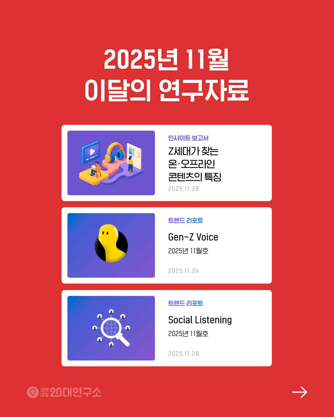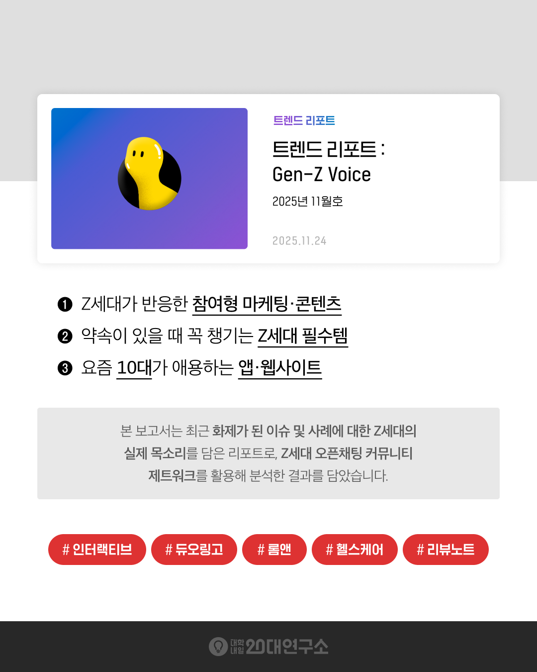 본 보고서는 최근 화제가 된 이슈 및 사례에 대한 Z세대의 실제 목소리를 담은 리포트로, Z세대 오픈채팅 커뮤니티 제트워크를 활용해 분석한 결과를 담았습니다. 대학내일20대연구소 멤버십 회원에게 선공개되며, 3개월 뒤 전체 공개로 전환됩니다.