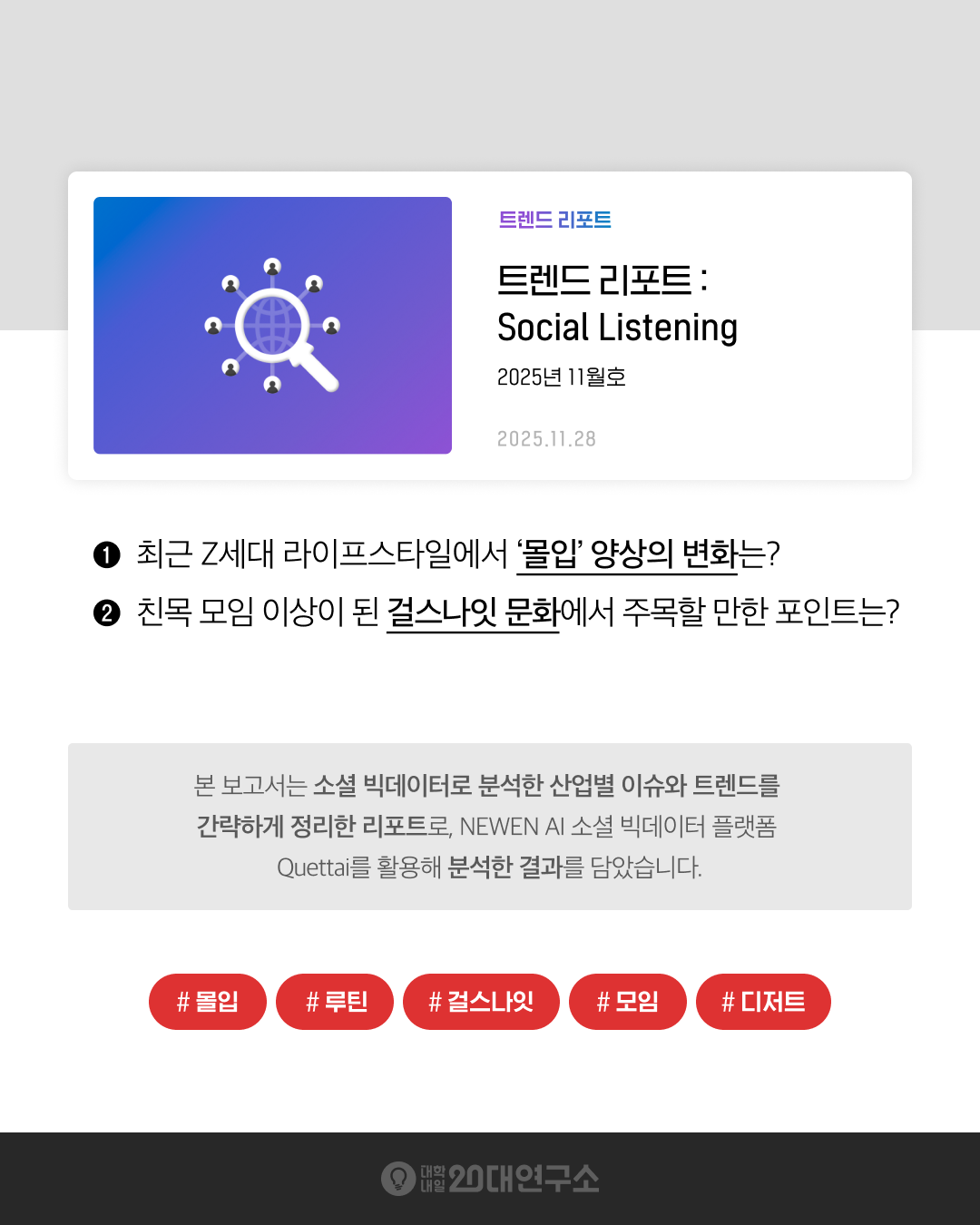 본 보고서는 소셜 빅데이터로 분석한 산업별 이슈와 트렌드를 간략하게 정리한 리포트로, NEWEN AI 소셜 빅데이터 플랫폼 Quettai를 활용해 분석한 결과를 담았습니다. 대학내일20대연구소 멤버십 회원에게 선공개되며, 3개월 뒤 전체 공개로 전환됩니다.