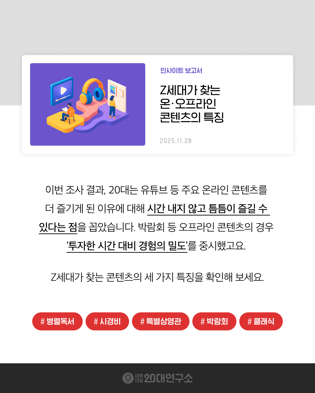 초개인화 시대, Z세대는 어떤 콘텐츠에 이끌리고 있을까요? 사람들의 취향이 다변화되면서 공통된 경향을 찾기도 점점 더 어려워지고 있는데요. 대학내일20대연구소는 19~49세를 대상으로 한 정량조사와 Z세대 대상의 정성조사, 소셜 빅데이터 등을 종합적으로 분석해 Z세대가 선호하는 콘텐츠의 특징을 세 가지 키워드로 정리했습니다.