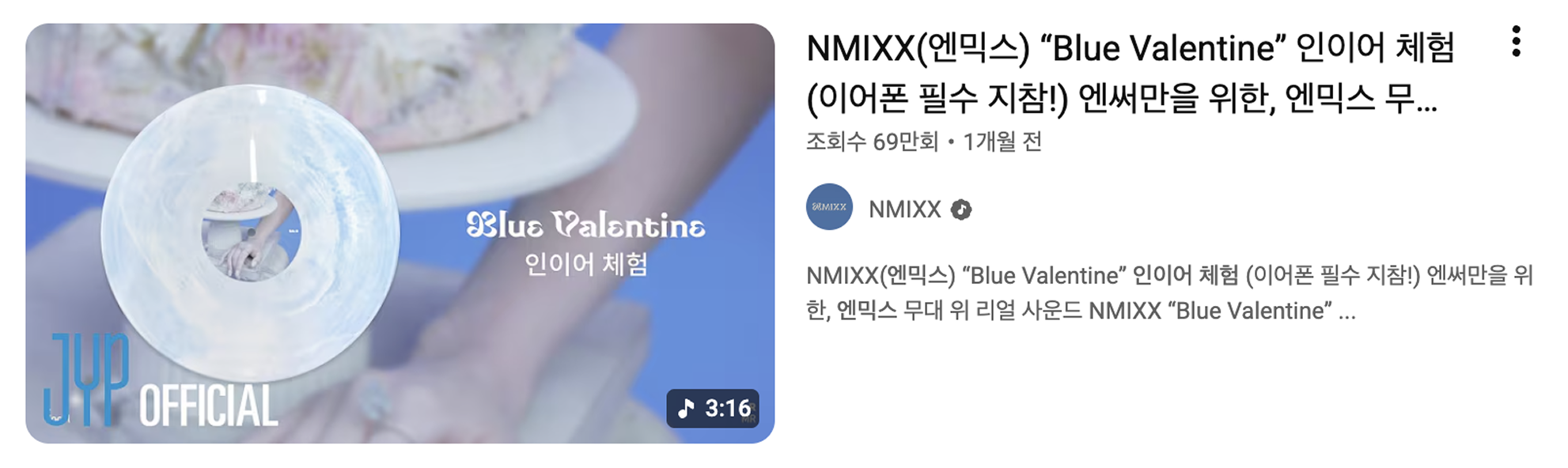 한편 엔믹스 공식 유튜브 채널에는 팬들을 위한 인이어 체험 영상이 업로드되었는데요. 엔믹스 멤버들이 실제 무대 위에서 듣는 리얼한 인이어 사운드를 공개한 거예요. 이어폰으로 영상을 들으면 왼쪽에서는 멤버들의 라이브 목소리가, 오른쪽에서는 MR이 나와요. 한쪽씩 들어보면 무대의 리얼함이 고스라히 전해집니다. 만약 인이어 이어폰으로 듣는다면 더 생생한 경험을 해볼 수 있겠죠? |