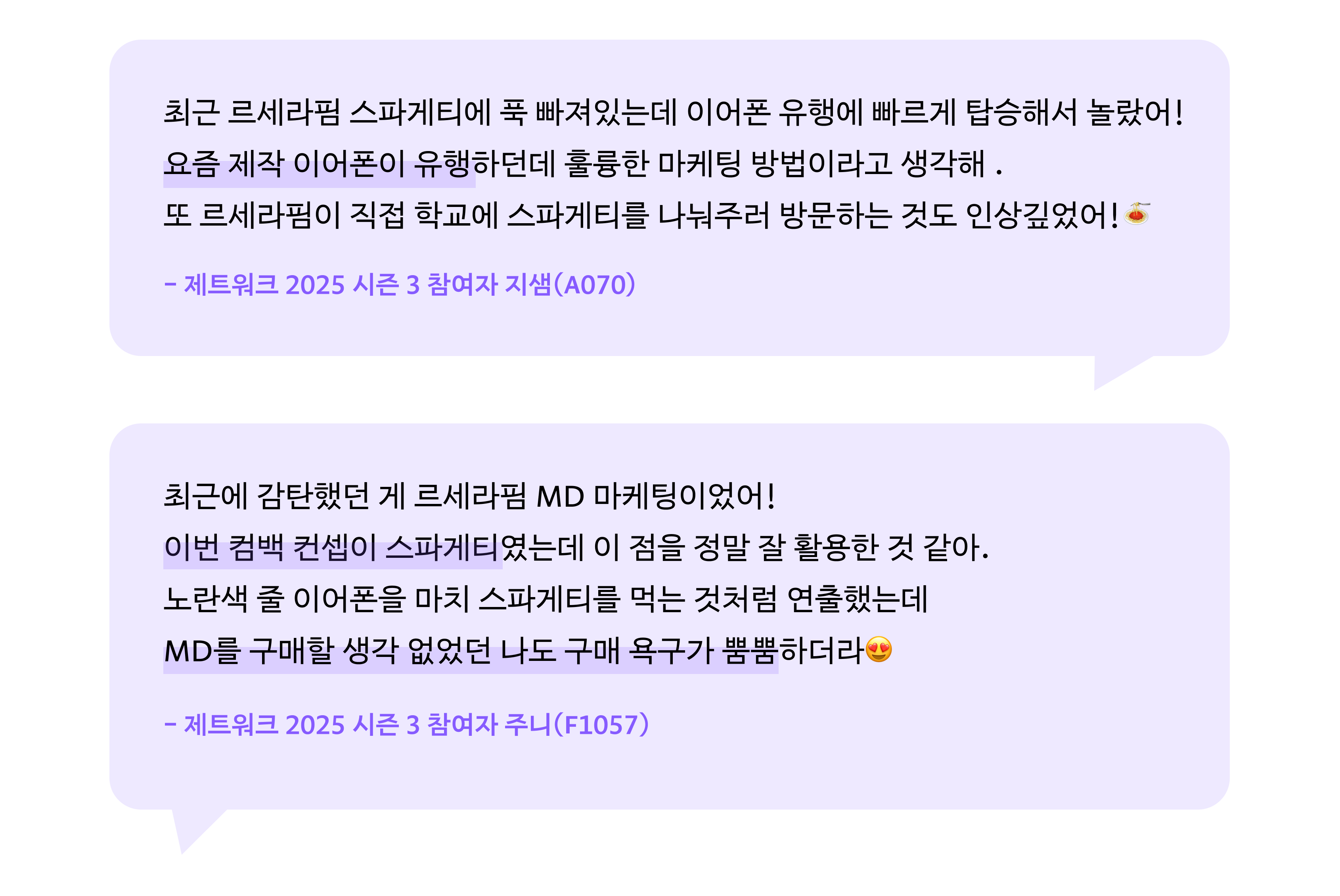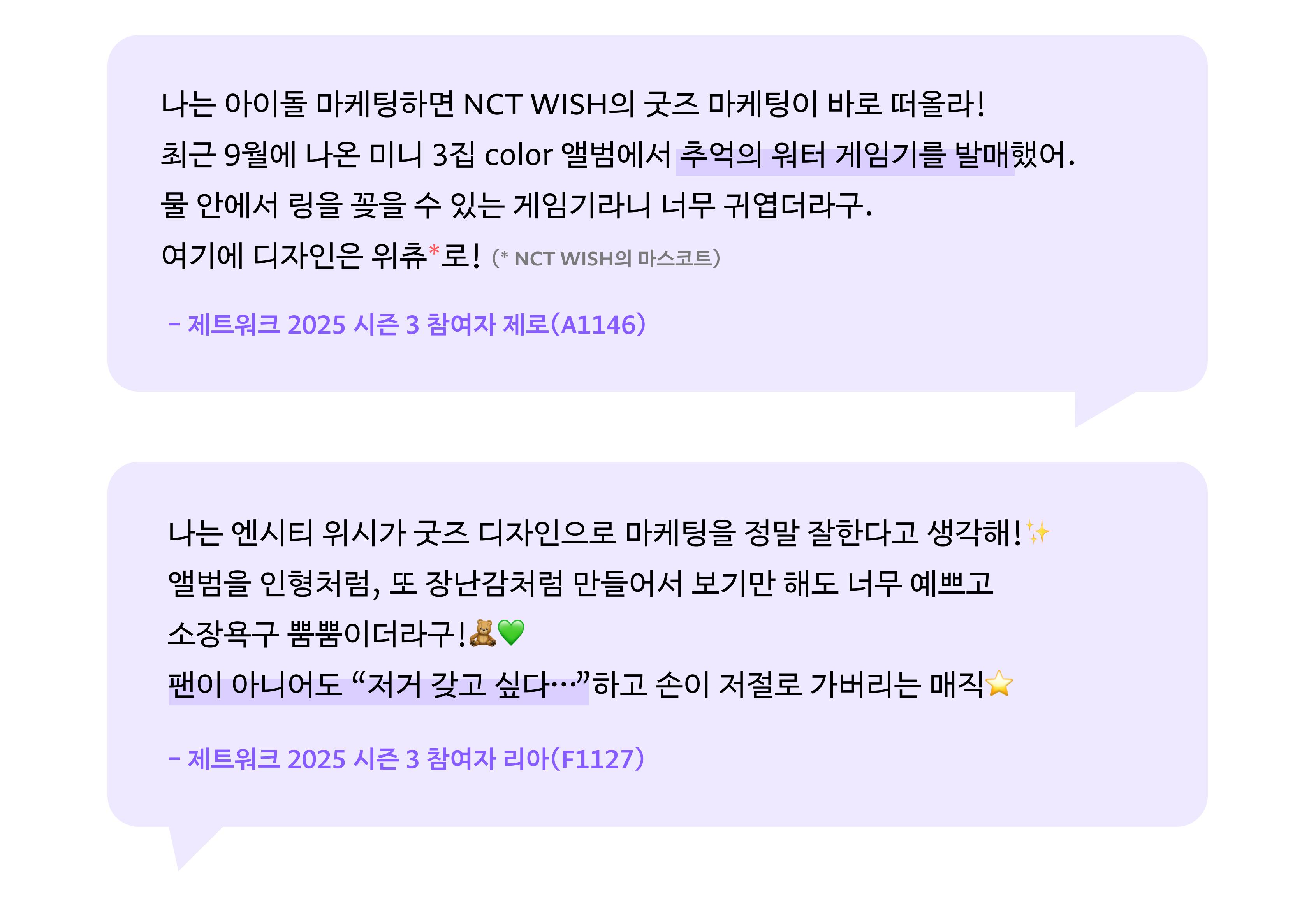 이처럼 굿즈가 대중화되는 시대에, 사람들의 마음을 사로잡는 아이템은 무엇일까요? 저는 굿즈 트렌드가 궁금할 때 늘 엔터 산업의 마케팅을 가장 먼저 살펴봅니다. 팬들의 심리를 누구보다 빠르게 파악하면서, 굿즈 마케팅에 진심인 분야가 바로 엔터 산업이니까요. 실제로 제트워크 커뮤니티에 “기억에 남는 아이돌 마케팅 사례”를 물었더니, 굿즈 마케팅에 대한 언급이 가장 많았어요. 오늘은 Z세대들이 직접 뽑은 매력적인 아이돌 굿즈를 소개합니다. |