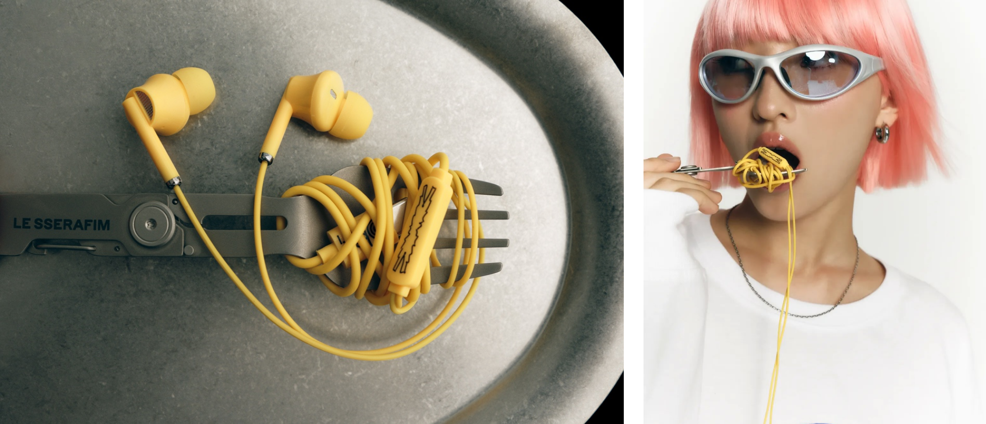 인이어는 아니지만 앨범 컨셉을 재밌게 살린 이어폰 굿즈가 하나 더 있는데요. 바로 르세라핌의 스파게티 이어폰입니다. ‘스파게티’라는 새로운 곡 컨셉의 맞춰, 스파게티를 형상화한 이어폰을 굿즈로 출시한 것인데요. 이어폰을 스파게티면처럼 포크로 베베 꼬아둔 연출이 감각적이 더라고요. 앨범도 컨셉에 맞게, 스파게티 브랜드를 연상시키는 패키지로 제작한 점도 흥미로워요. |