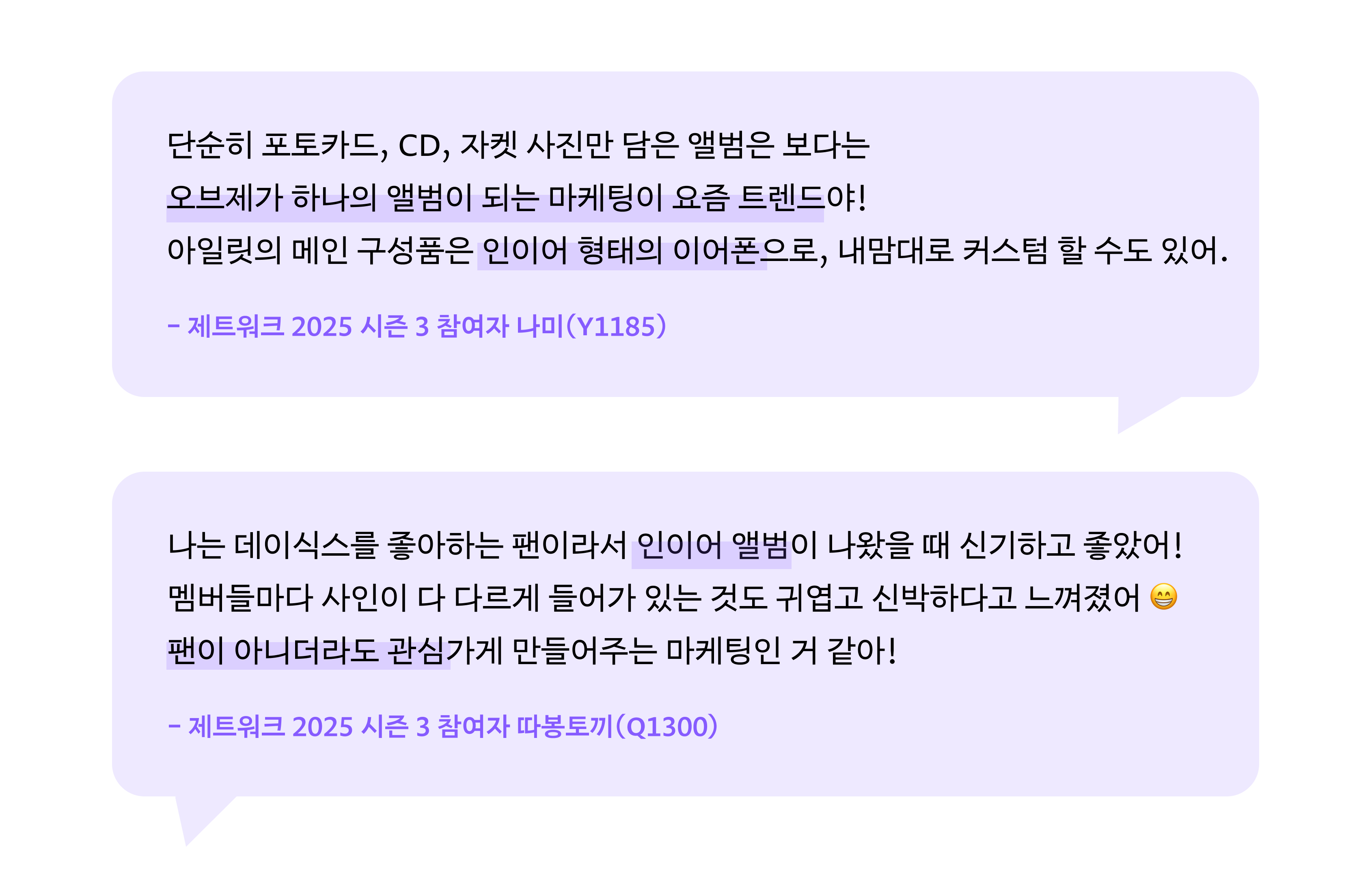 굿즈 마케팅에서도 가장 많은 언급이 있었던 것은 ‘인이어 앨범’이었어요. 인이어는 가수들이 무대에서 본인의 목소리를 모니터링 하기 위해 착용하는 이어폰인데요. 귀모양에 맞춰 커스텀으로 제작하기 때문에, 언제부터인가 무대의 꾸밈 요소로 정착하기도 했어요. 팬들은 내가 좋아하는 가수나 아이돌의 인이어를 궁금해 하는 일도 많아요. |