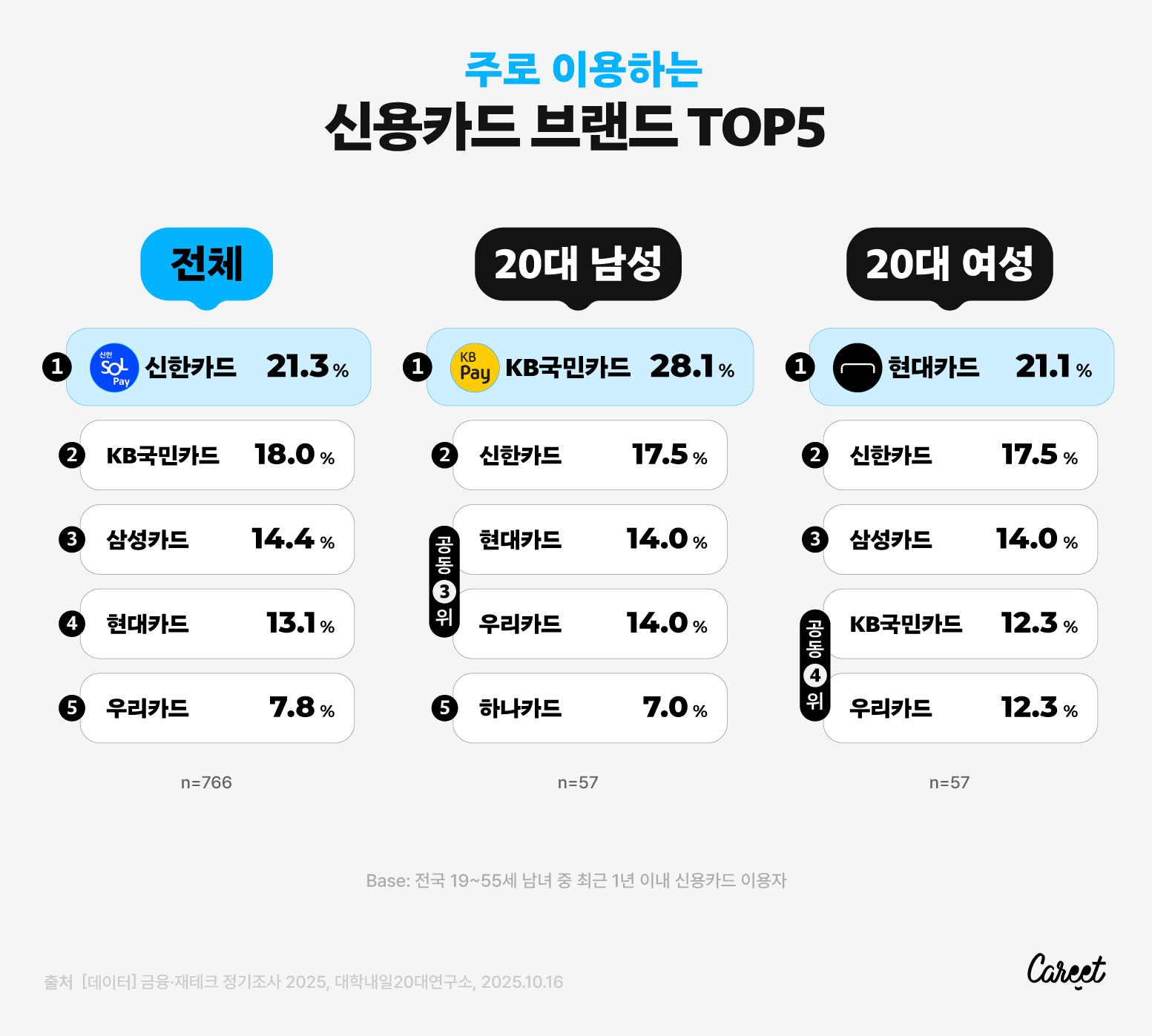 지난 9월 대학내일20대연구소가 전국 19~55세 남녀를 대상으로 ‘주로 이용하는 신용카드’를 알아본 결과, 신한카드(21.3%)가 1위로 나타났어요. KB국민카드(18.0%), 삼성카드(14.4%) 등이 뒤를 이었고요.