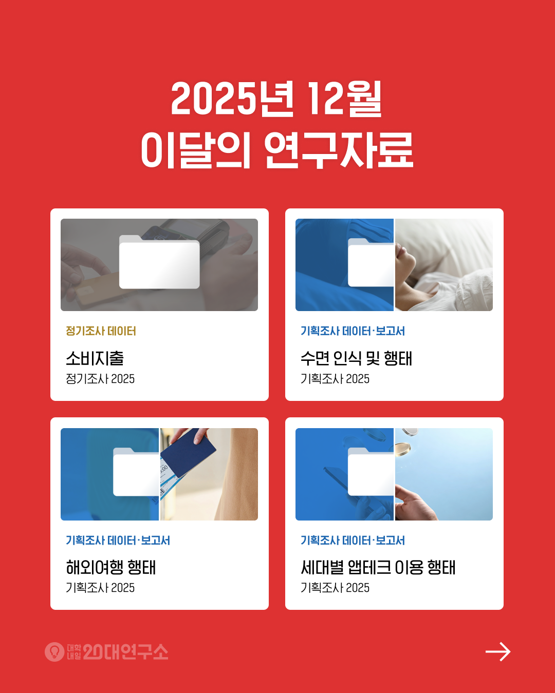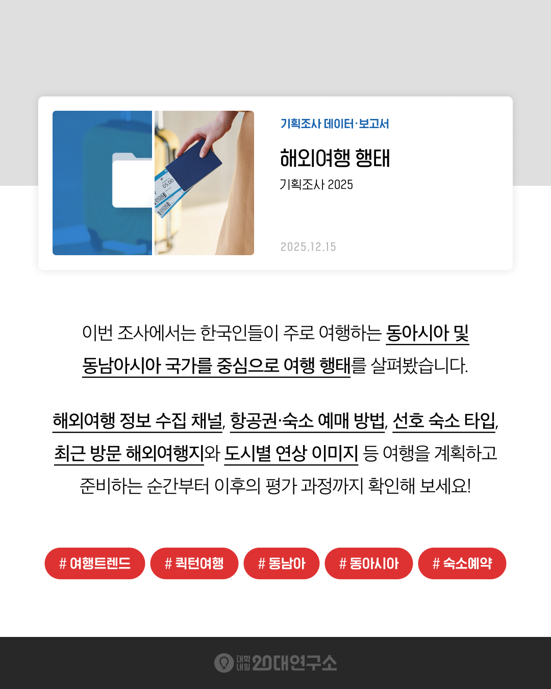 [데이터] 해외여행 행태 기획조사 2025에서는 이처럼 해외여행에 대한 가치와 선호 형태는 물론 해외여행 정보 수집 채널, 항공권·숙소 예매 방법, 선호 숙소 타입, 최근 방문 해외여행지와 도시별 연상 이미지 등 여행을 계획하고 준비하는 순간부터 여행 이후 여행지에 대한 평가까지 폭넓게 다뤘습니다. 자세한 내용은 데이터를 통해 확인해 보세요!