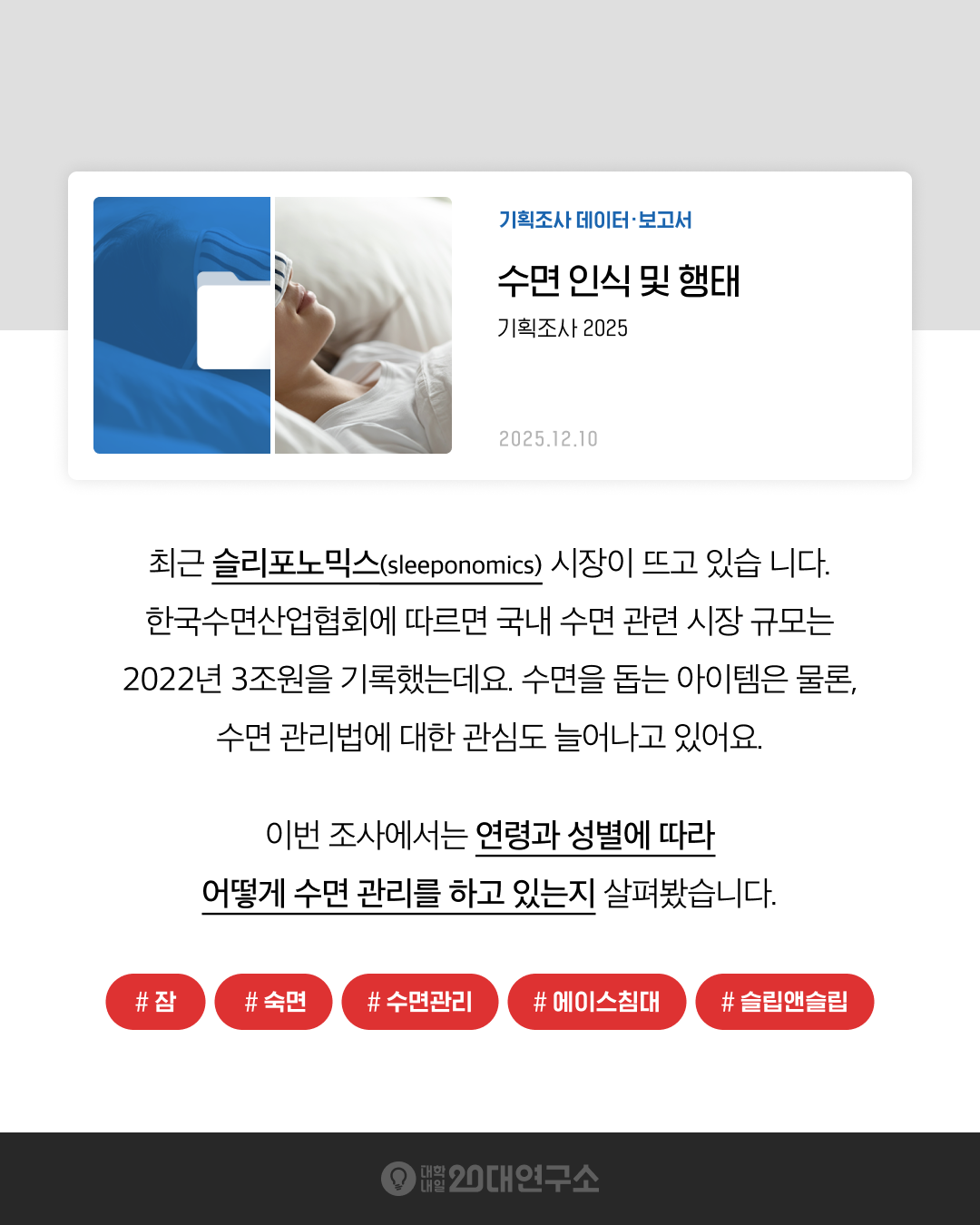 평소 취침 시각, 자기 전 루틴, 수면에 대한 만족도 등 수면에 대한 인식을 비롯해 숙면을 위해 실천하는 생활 습관, 숙면을 위해 사용하는 제품, ‘수면·숙면’ 하면 떠오르는 브랜드 등 수면 관리에 대한 행태까지 알아봤았습니다. 자세한 내용은 데이터를 통해 확인해 보세요!