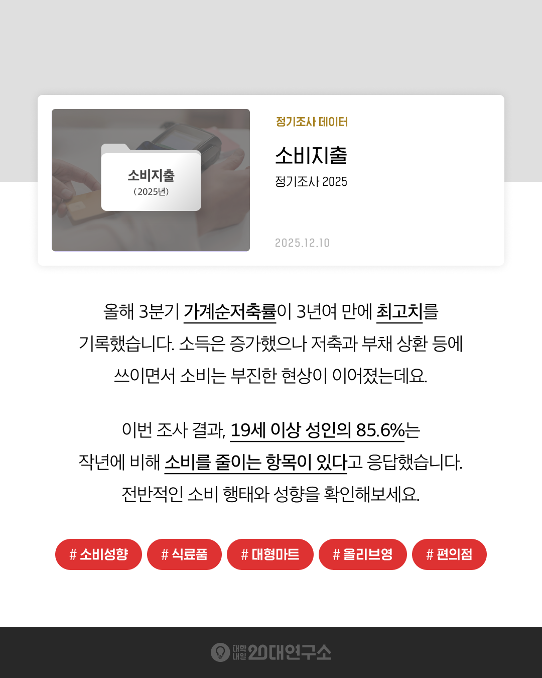 [데이터] 소비지출 정기조사 2025에서 항목별 월 평균 지출액을 포함해 의류·잡화, 화장품, 식품·음료, 주류, 생활용품, 인테리어 소품, 디지털기기, 가전 등의 구매처 등 전반적인 소비 행태와 중요하다고 생각하는 소비 가치, 소비 성향 등을 확인해 보세요.