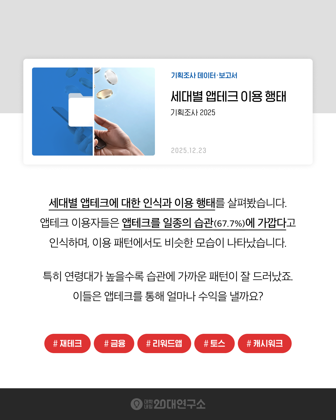 지난 10월 진행한 금융·재테크 정기조사 결과에 따르면, 최근 1년 이내 재테크 경험자 중 51.1%는 앱테크를 이용해 봤다고 응답했습니다. 금융 소비자 절반이 이용할 만큼 익숙한 서비스로 자리 잡은 건데요. Z세대에서는 62.4%로 세대 중 가장 높은 이용률을 보여 눈길을 끌었습니다. 그렇다면 세대별로 앱테크를 어떻게 인식하고, 이용하고 있을까요?