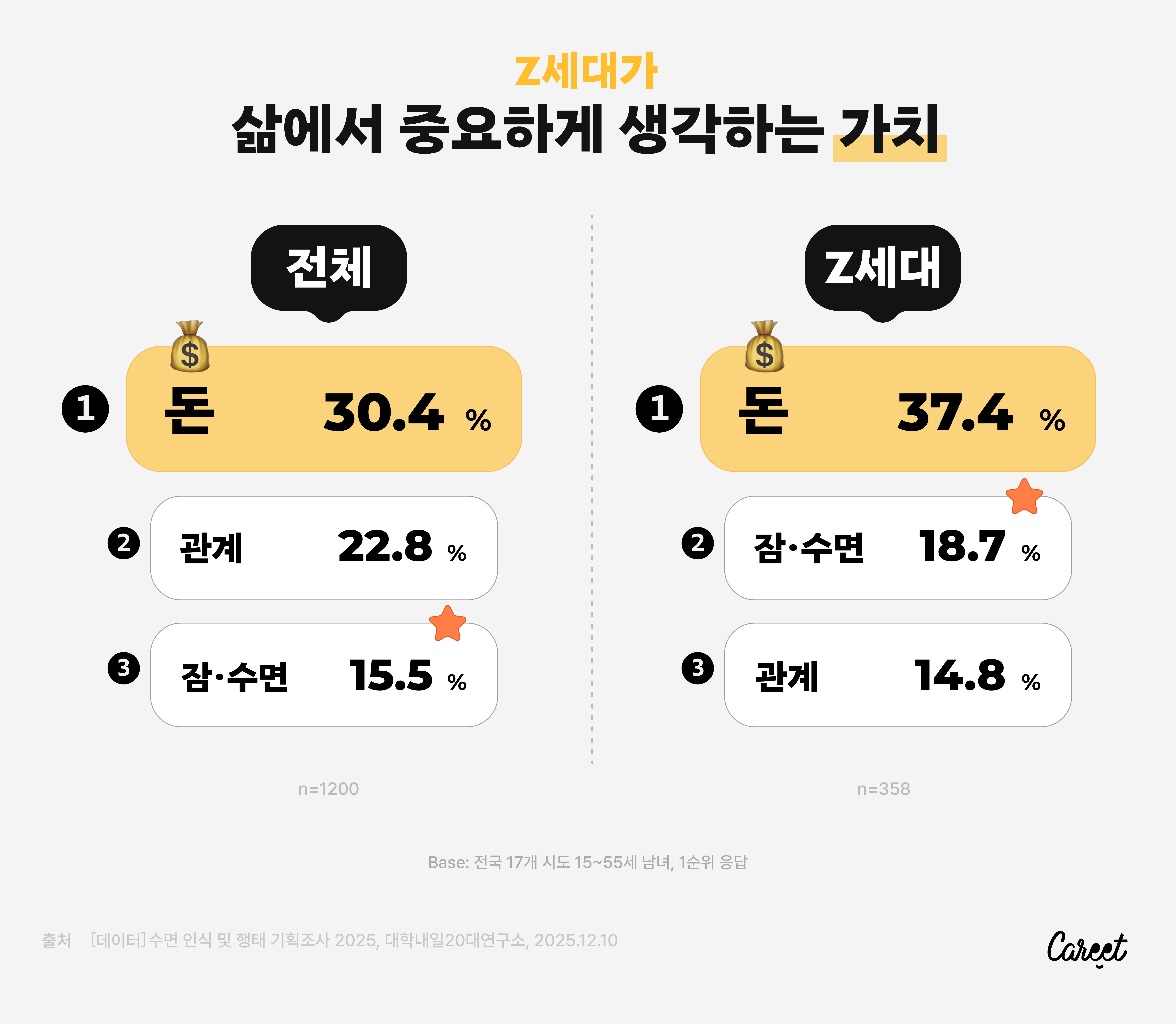 데이터에서도 수면에 대한 관심을 살펴볼 수 있어요. 전국 15~55세 1,200명을 대상으로 ‘삶에서 중요하게 생각하는 가치’를 물어본 결과, Z세대의 응답에 독특한 특징이 있었습니다. 먼저 1위는 돈(37.4%)으로 다른 수치들을 압도했고, 전체(30.4%)에 비해 높았어요. 2위는 잠·수면(18.7%)으로, 모든 세대 중 유일하게 가족·친구·연인과의 관계보다 수면을 더 중요하게 생각하는 세대로 나타났습니다.