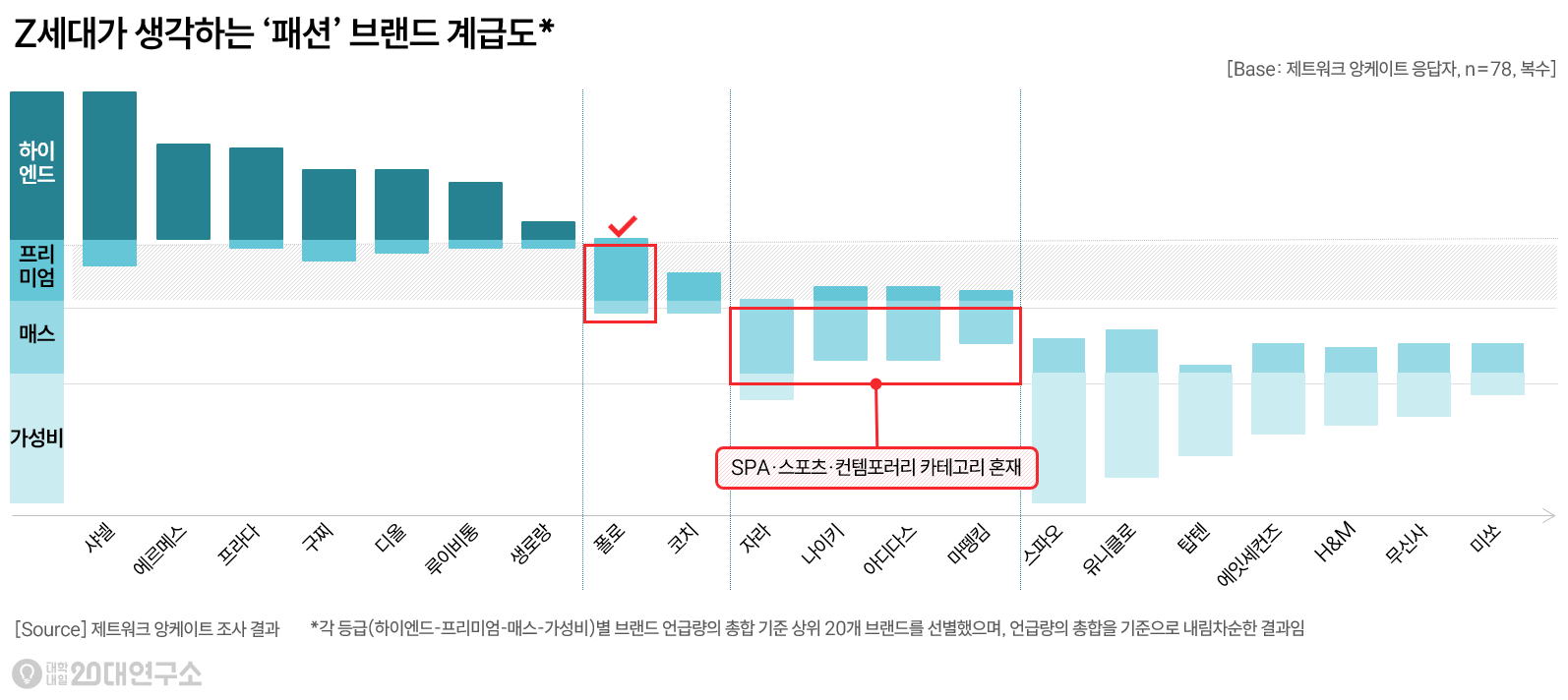 한편. 일부 하이엔드·매스 브랜드가 프리미엄 영역에 중첩된 경우는 있었지만, 폴로(랄프 로렌)를 제외하고는 ‘프리미엄’으로 인식되는 경우가 많지 않았어요. 즉 Z세대 패션 시장에서 프리미엄 등급 자체의 존재감이 부족하다고 볼 수 있죠. ‘매스’의 경우 SPA·스포츠·컨템포러리 등 여러 카테고리의 브랜드가 혼재돼 있었는데요. Z세대에게 ‘매스 브랜드’ 인식이 비교적 유동적으로 해석된다는 점을 알 수 있습니다. |