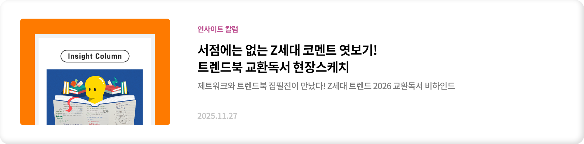 여기서 나온 인사이트는 이후 《Z세대 트렌드 2026》의 ‘리퀴드 콘텐츠’ 파트에서 중요하게 활용되기도 했어요. 참, 트렌드 도서가 발간된 뒤 제티들과 함께 ‘교환독서’를 진행해 본 것도 기억에 남아요. Z세대 트렌드에 대한 찐 Z세대의 의견을 들어볼 수 있어 뜻 깊었어요. 이렇게 제트워크는 온라인에서 오프라인에 이르기까지 다양하게 가지를 뻗치고 있는데요. 무엇보다도, 제티들에게 재미와 유익함을 더할 수 있도록 부단히 노력하고 있답니다!
