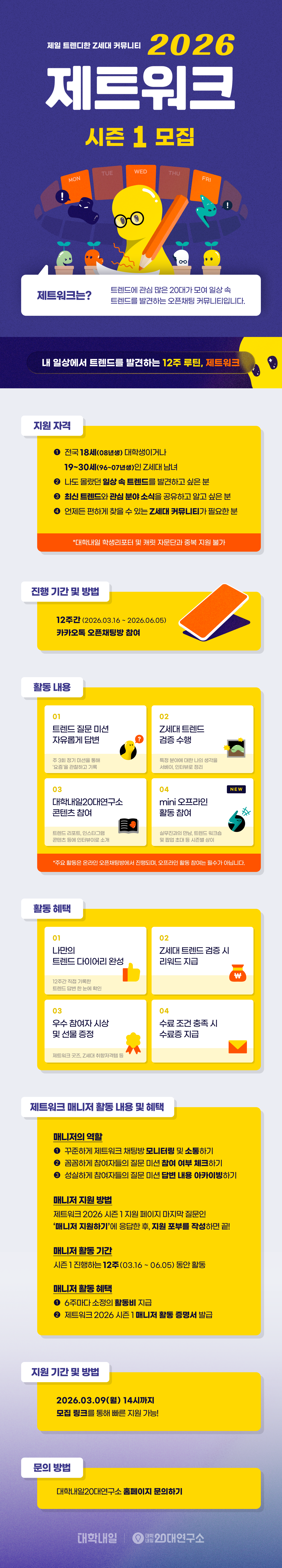 Q. 오픈채팅은 실명으로 참여해야 하나요? 익명으로 운영됩니다! Q. 활동자 선발 기준이 있나요? 자신의 일상 속에서 트렌드를 포착하고, 누구보다 빠르게 실천하고 있는지가 중요합니다. Q. 서울을 비롯한 수도권 거주자만 신청 가능한가요? 아닙니다. 제트워크는 오픈채팅방으로 운영되기 때문에 지역 관계 없이 전국의 18세(08년생) 대학생이거나 19~30세(96년생~07년생)인 Z세대 남녀 모두에게 열려 있습니다! Q. 어떤 활동이 추가되었나요? 주요 활동은 오픈채팅방에서 온라인으로 진행되지만, 대학내일 실무진과의 만남, 트렌드 워크숍 및 팝업스토어 초대 등 소소하지만 제트워크에서만 경험할 수 있는 오프라인 활동도 기다리고 있어요😉 Q. 오프라인 활동은 무조건 참여해야 하나요? 아닙니다! 오프라인 활동 참여는 필수가 아니며, 수료 조건에도 영향을 미치지 않습니다. Q. 매니저로 참여할 수 있는 방법이 따로 있을까요? 제트워크 2026 시즌 1 지원 페이지 마지막 질문인 ‘매니저 지원하기’에 응답한 후, 포부를 남겨주시면 됩니다. Q. 매니저 활동은 제트워크 활동과 무엇이 다른가요? 매니저는 방장을 도와 오픈채팅방을 모니터링👀하고, 소통을 주도🙌하는 역할이랍니다! 참여자들의 미션 현황을 체크하고 아카이빙하여 우수 멤버 선정🏆에도 참여하실 수 있어요~! 또한, 대학내일 제트워크 매니저 활동 증명서📋와 함께 6주마다 소정의 활동비💸도 지급해드립니다! Q. 매니저도 트렌드 질문 미션에 답변하거나 이벤트 등 제트워크 활동에 참여하는 건가요? 아니면 모니터링 및 우수멤버 선정만 하는 건가요? 제트워크 활동과 매니저 활동은 분리된 활동이 아니며, 제트워크 활동에 추가로 매니저 업무를 진행합니다. 매니저 또한 미션과 이벤트에 참여합니다. |