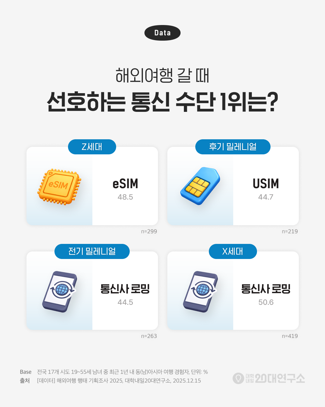 한편 해외여행 시 이용하는 통신 및 결제 수단도 과거에 비해 많은 점이 달라졌습니다. 먼저 ‘선호하는 통신 수단’을 조사한 결과, ‘통신사 로밍’ 응답률은 X세대(50.6%)로 갈수록 높았어요. 반면 ‘현지 이심(e-SIM)’ 응답률은 Z세대(48.5%)로 갈수록 높아졌죠.