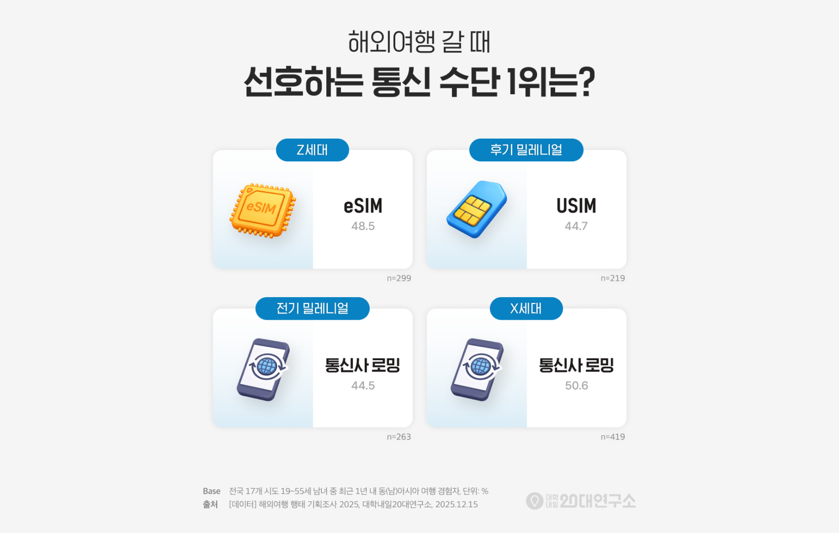 해외여행 시 이용하는 통신 및 결제 수단도 과거에 비해 많은 점이 달라졌습니다. 먼저 ‘선호하는 통신 수단’을 조사한 결과, ‘통신사 로밍’ 응답률은 X세대(50.6%)로 갈수록 높았어요. 반면 ‘현지 이심(eSIM)’ 응답률은 Z세대(48.5%)로 갈수록 높아졌고요. |