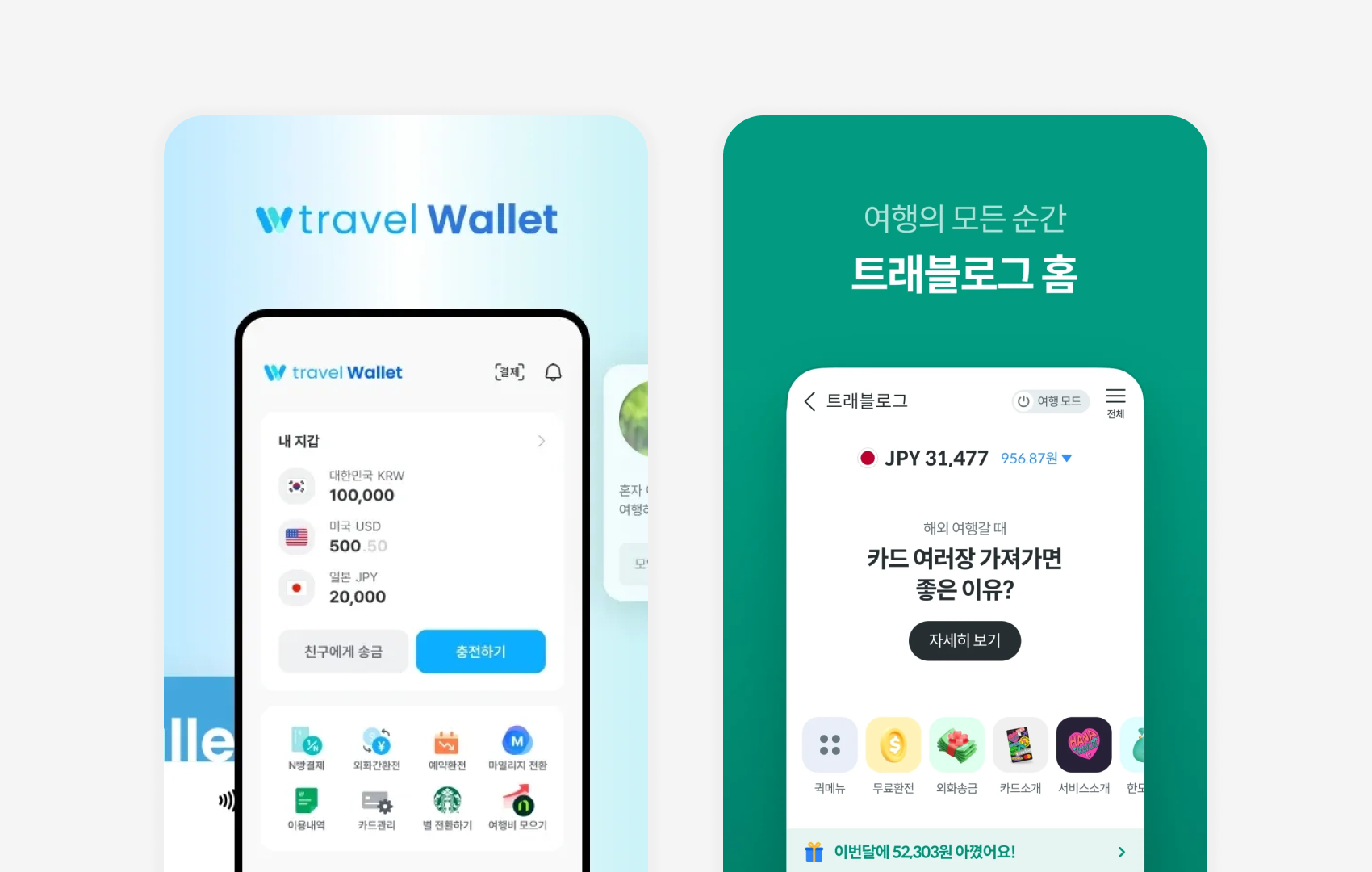 (좌)트래블월렛 앱 / (우)하나머니(트래블로그) 앱 |