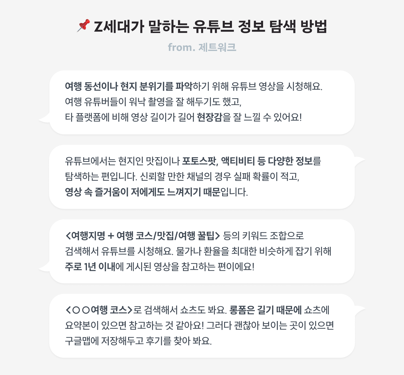 이번 조사 결과, 해외여행 정보를 얻는 채널은 전 세대에서 ‘유튜브(쇼츠 제외)’가 1위로 나타났습니다. 특히 Z세대(16.7%)는 전체 응답자(11.3%)에 비해 유튜브 쇼츠를 통해 정보를 얻는 비율이 높았어요. 그렇다면 Z세대는 유튜브에서 해외여행 정보를 어떤 식으로 정보를 찾을까요? 제트워크 응답에서 힌트를 얻을 수 있습니다. |