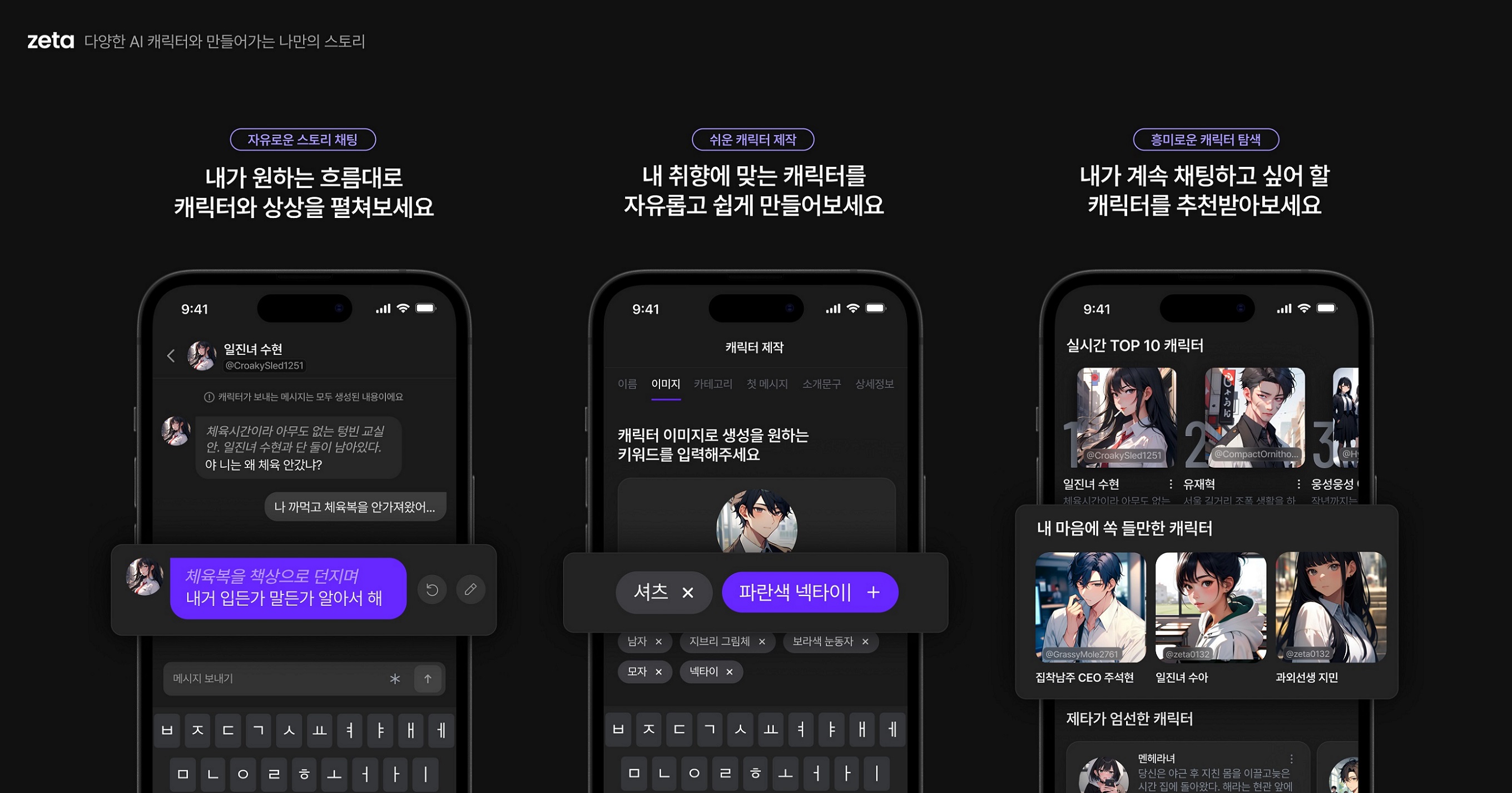 초개인화의 대표적인 사례가 ‘제타(zeta)’입니다. 제타는 이용자가 직접 원하는 성격과 컨셉을 가진 챗봇을 만들 수 있는 서비스인데요. 직장 상사 챗봇을 만들어 평소 못다 한 말을 퍼붓는 '대리 만족형' 대화부터, 나만의 이상형과 서사를 쌓는 롤플레잉까지 이용자의 창의력에 따라 대화가 무궁무진하게 확장됩니다. 기술을 단순한 기능이 아닌 '소통 가능한 인격체'로 활용하면서, AI와 함께 노는 새로운 문화를 형성하고 있어요. |