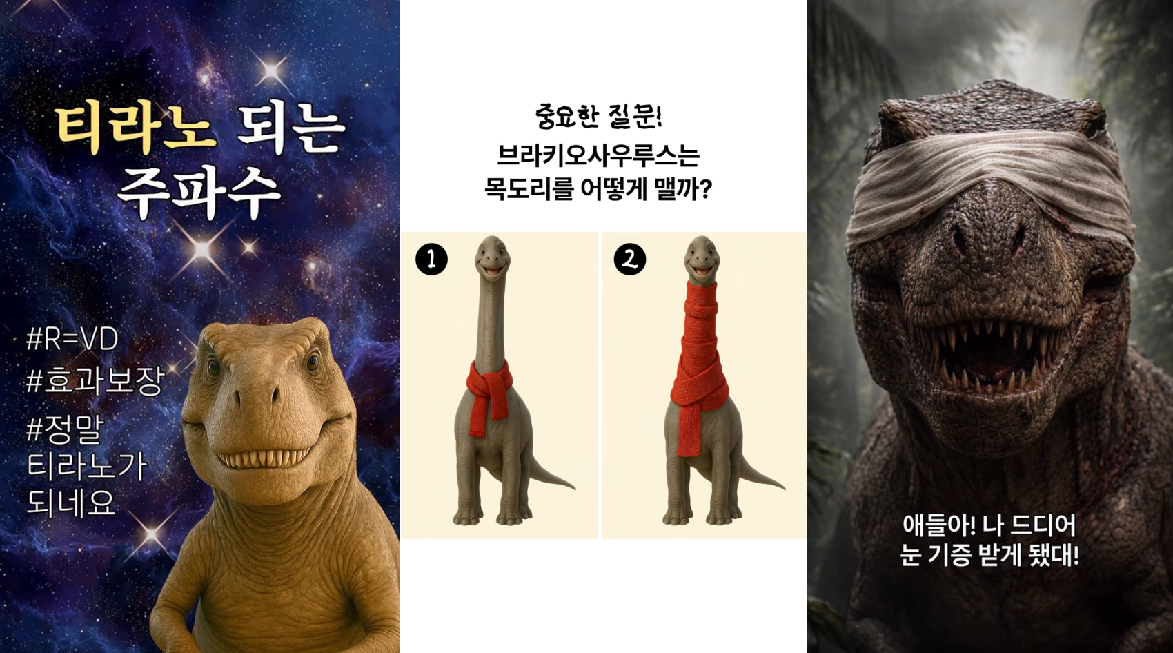 최근 SNS에서 가장 핫한 AI 공룡 캐릭터를 알고 계신가요? '요즘공룡'이 어이없지만 유쾌한 밈으로 화제가 되면서 빠르게 인기를 얻고 있어요. “듣기만 해도 티라노가 될 수 있다”는 식의 다소 황당한 밈으로 반응을 이끌어 내는데요. 팔로워들이 자발적으로 공룡 세계관에 참여하면서 확산되고 있습니다. 공룡 캐릭터와 온라인 밈을 조합하며 MZ공룡의 모습을 보여주는 점이 흥미로워요. Z세대가 공룡에 '진심'이라는 점을 읽고 AI를 활용해 빠르게 소통하며 참여를 유도하고 있는 영리한 사례입니다. |